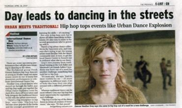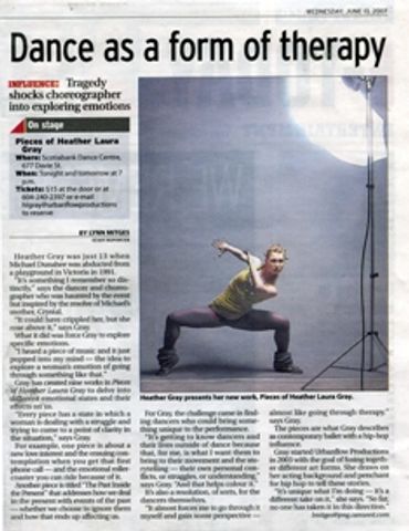 She has been commissioned by Ballet Kelowna, "the response." dance company, SPRING LIGHTS for The City of Vancouver’s Cherry Blossom Festival two years in a row, Lamon Dance Company, Coastal City Ballet along with the American Spoken Word artist Mahogany Brown. Her full length contemporary dance piece, THE TUNNEL was quoted by the Georgia Straight - "Expect dramatic and haunting visual effects and raw yet honed dance".