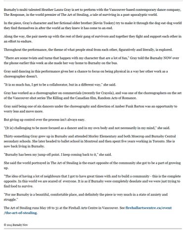 Heather's live work has been presented at the Vancouver International Dance Festival, The Shadbolt Centre, Dance All Sorts, Dances for a Small Stage, Pop Up Dances, The Dance Centre (Vancouver), Eco Fashion Week and Soundbites Festival in New York City.